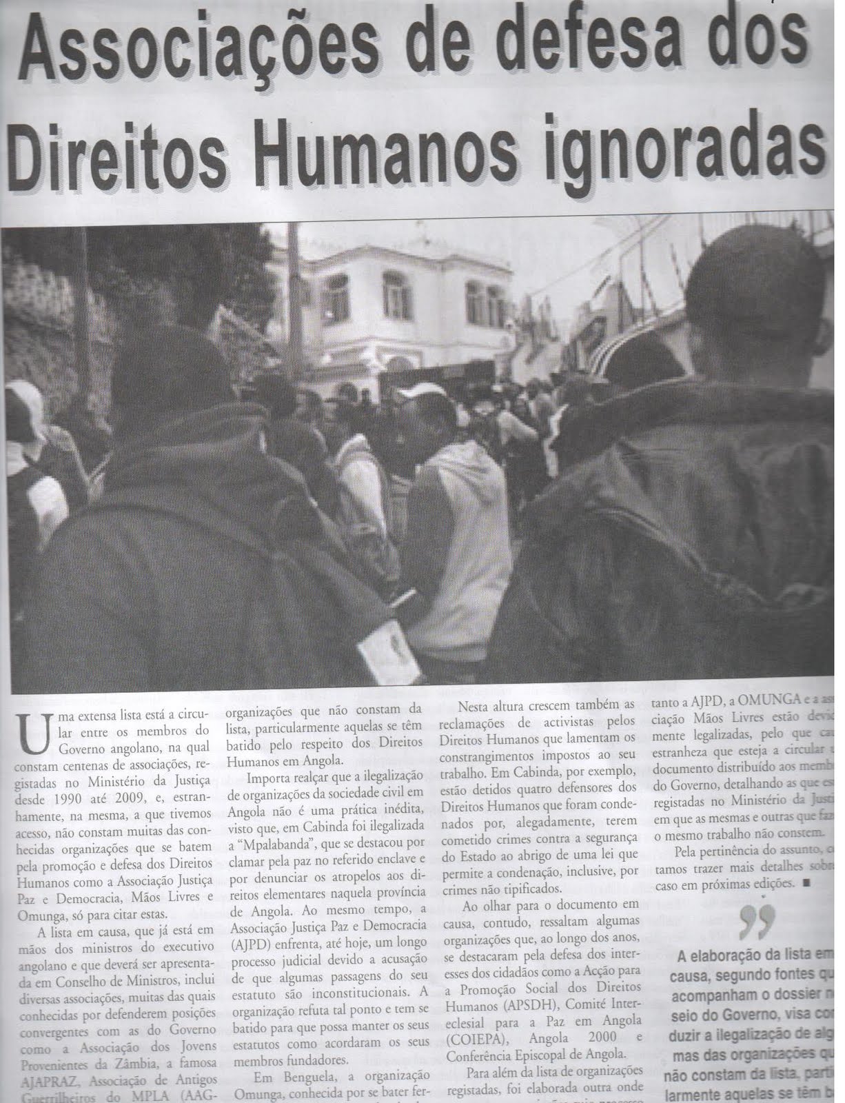 De acordo ao artigo, salienta-se a certa altura: “A elaboração da lista em causa, segundo fontes que acompanham o dossier no seio do Governo, visa conduzir a ilegalização de algumas das organizações que não constam da lista, particularmente aquelas que se têm batido pelo respeito dos Direitos Humanos em Angola.” Em parágrafo inicial, pode-se ler: “uma extensa lista está a circular entre os membros do Governo angolano, na qual constam centenas de associações, registadas desde 1990 até 2009, e, estranhamente, na mesma, a que tivemos acesso, não constam muitas das conhecidas organizações que se batem pela promoção e defesa dos Direitos Humanos como a Associação Justiça, Paz e Democracia, Mãos Livres e Omunga, só para citar estas.”