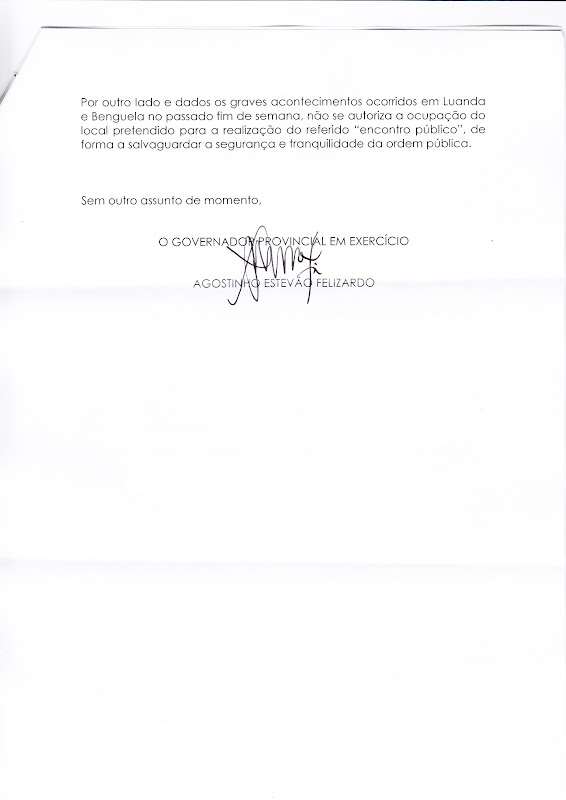 III – Dado os acontecimentos ocorridos em Luanda e Benguela no passado fim-de-semana não se autoriza para salvaguarda da segurança e tranquilidade da ordem pública