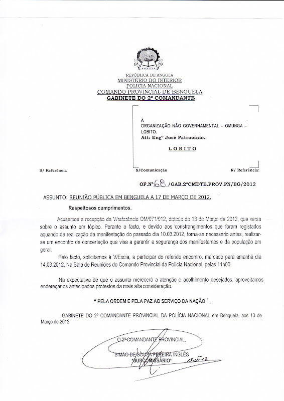 Por outro lado, recebeu também hoje uma carta do 2.º Comandante Provincial de Benguela para um “encontro de concertação que visa garantir a segurança dos manifestantes e da população em geral.” Este encontro, de acordo à nota do comando provincial, deve-se “aos constrangimentos que foram registados aquando da realização da manifestação do passado dia 10.03.2012”.