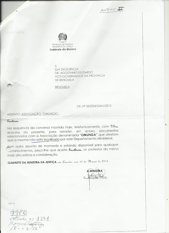 Com bastante preeocupação, a OMUNGA teve acesso ao vosso OF. N.º 002524/GMJ/2012, de 16 de Março de 2012, dirigido ao Exmo. Sr. Vicce-governador Provincial de benguela, Dr. Agostinho Felizardo onde declara ter remetido, “em anexo, documentos relacionados com a Associação denomidada ‘OMUNGA’ que atestam que a mesma não está legalizada por este Departamento Ministerial.”