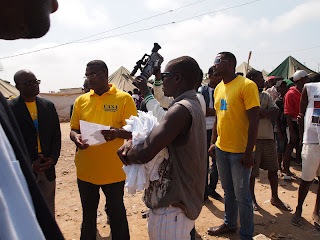 Já na manhã de hoje, 18 de Maio, para além da agenda política de Abel Chivukuvuku, este aceitou o convite da OMUNGA e visitou duas comunidades no Lobito. A primeira foi a do 16 de Junho. Esta comunidade constituída por cerca de 200 jovens ex moradores de rua, localiza-se no B.º da Lixeira. A abrigarem-se maioritariamente há cerca de 7 anos em tendas em completa degradação, misturando várias famílias em cada tenda, é um projeto da Administração Municipal do Lobito. Com o propósito de retirar estes jovens do centro da cidade, há 7 anos foi-lhes prometido desenvolver-se um projeto de auto-construção dirigida. Mas até hoje os jovens aguardam pela concretização destas promessas. Em Dezembro último, o Governador da Província, visitou este local a convite dos jovens e deixou no ar novas promessas. Umas, a continuidade das já idosas promessas da Administração Municipal. Outras novas.